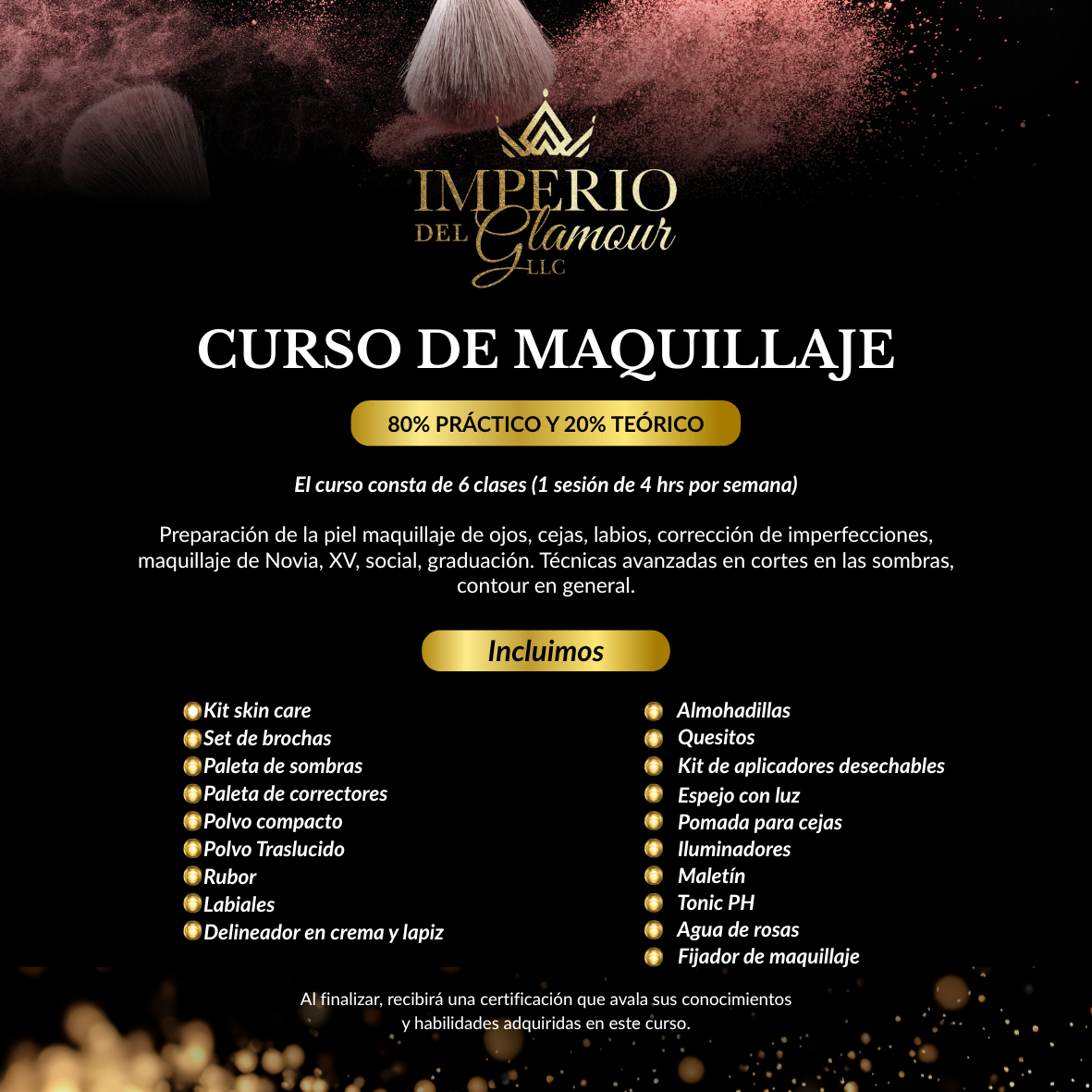 Curso integral de maquillaje profesional para eventos especiales como novias, XV, sociales y graduaciones. Aprende desde skin prep hasta contornos y técnicas avanzadas.