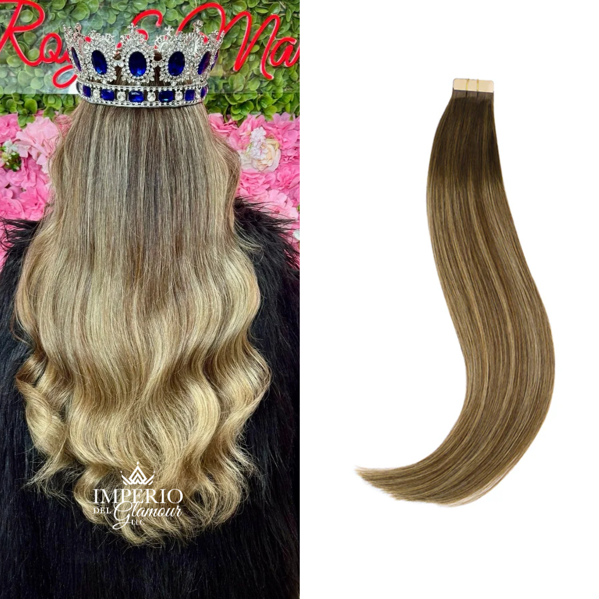 100 gramos | Las extensiones Tape con efecto balayage ofrecen una transición de color perfecta para un look degradado y sofisticado. Su mezcla de tonos crea un efecto natural de luz y sombra, ideal para quienes buscan un estilo moderno.
